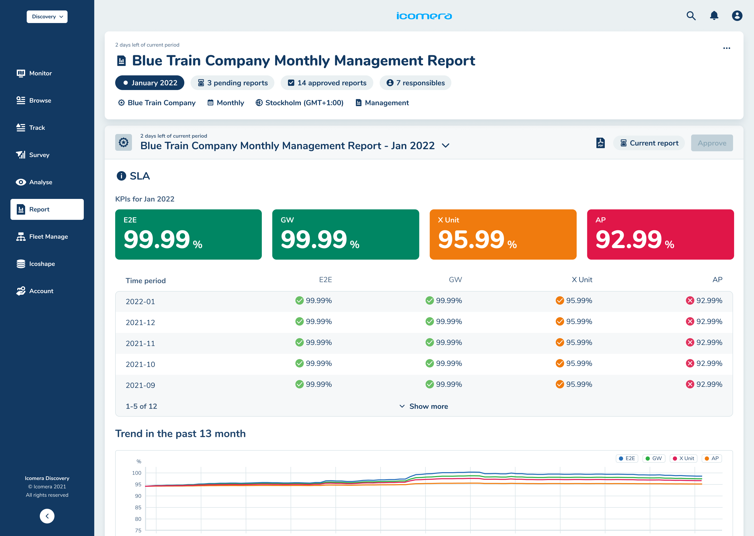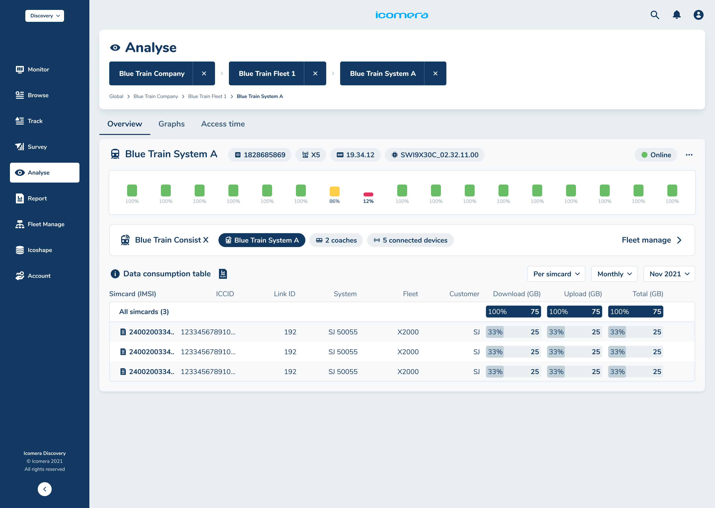 As the leading provider of mobile Internet connectivity solutions for public transport, Icomera serves millions of passengers daily. All this data needs to be handled efficiently to maintain a fast and reliable connection. That's where the Discovery tool comes into play. Developed from the ground up, Discovery is a powerful cloud-based platform and tool that provides enhanced monitoring of fleets and systems in real-time, enabling unrivaled analysis capacity for operators and a smoother wifi experience for passengers.