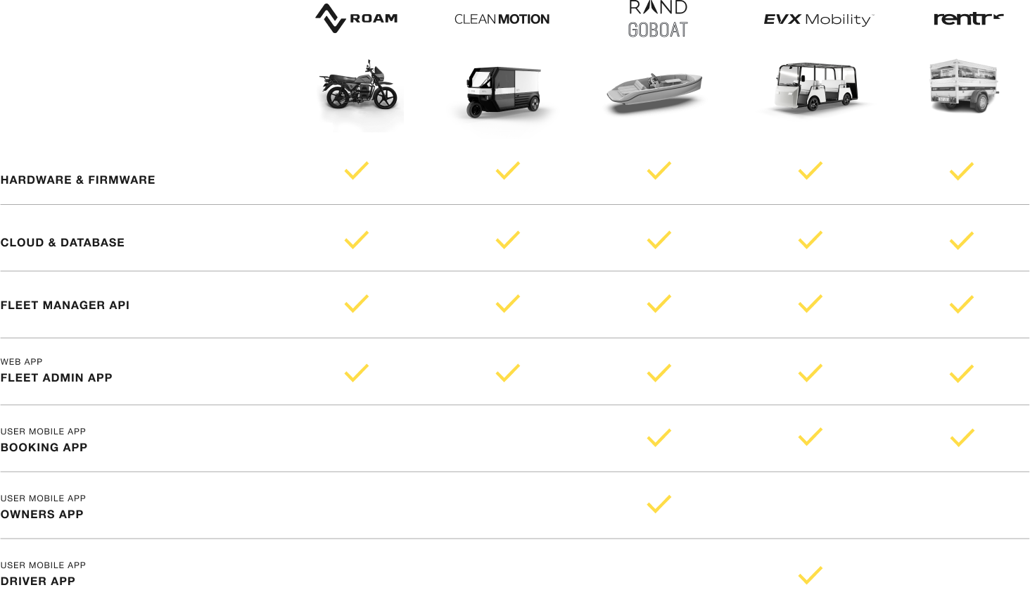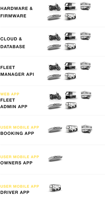 Elevate, our IoT solution, allows you to connect your product (e.g. vehicle) using our hardware device and monitor vehicle vitals in our fleet management web dashboard. We typically complement this with an end-user mobile app where features depend on your unique needs, e.g an app could show vehicle data, onboard drivers, allow users to book a vehicle or pay for vehicle usage.