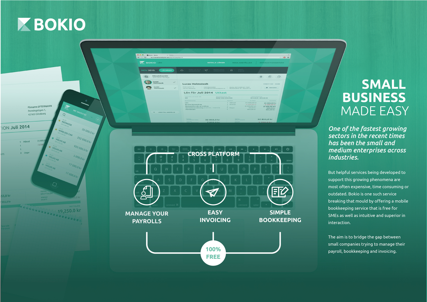 Bokio make today´s entrepreneurs able to independent of location manage payrolls, bookkeeping and invoicing from a smartphone or tablet. It´s free to use and acts as a platform for partners to provide credits, pension, insurance and services.