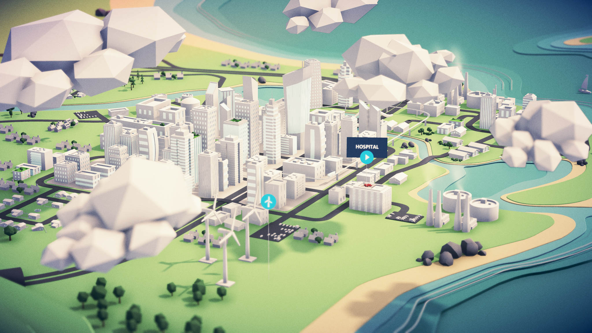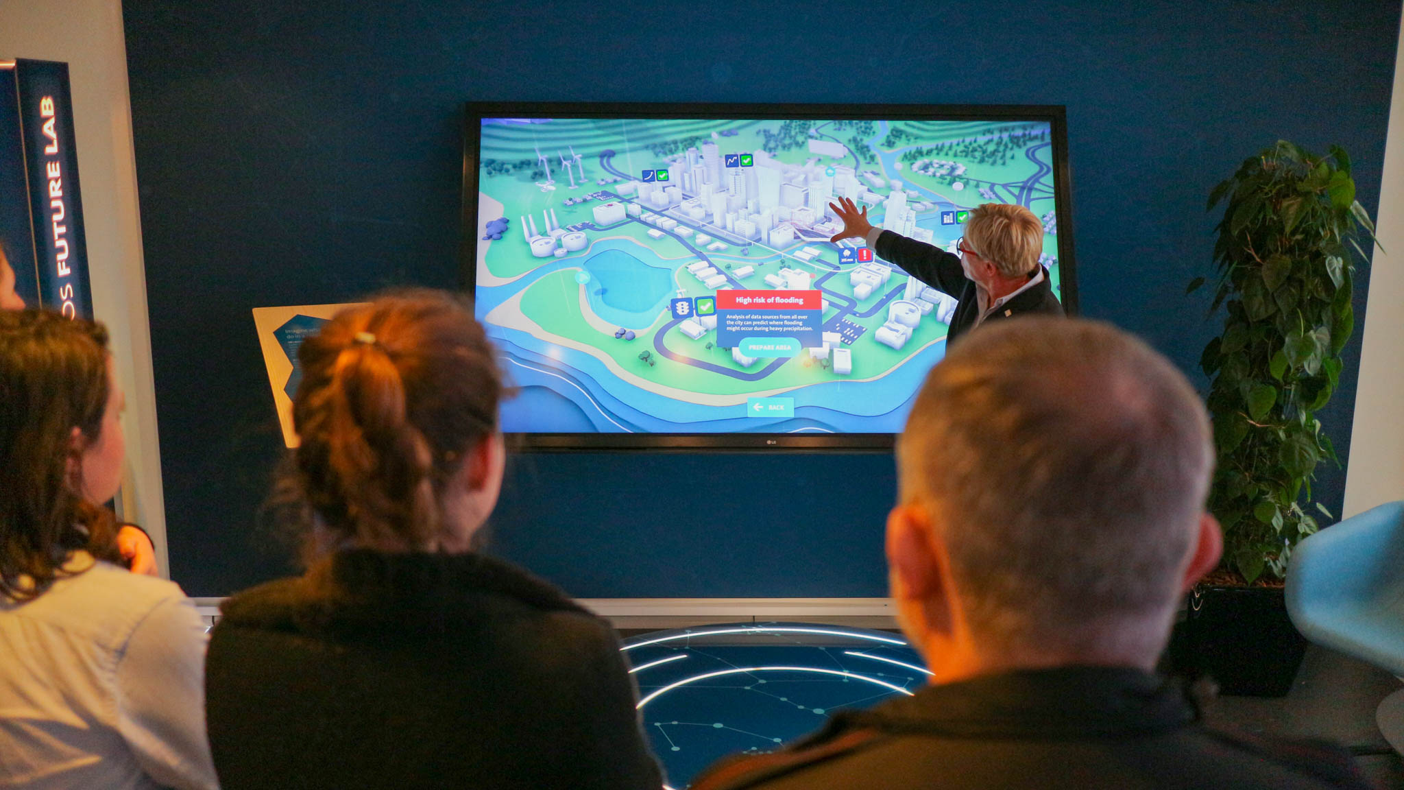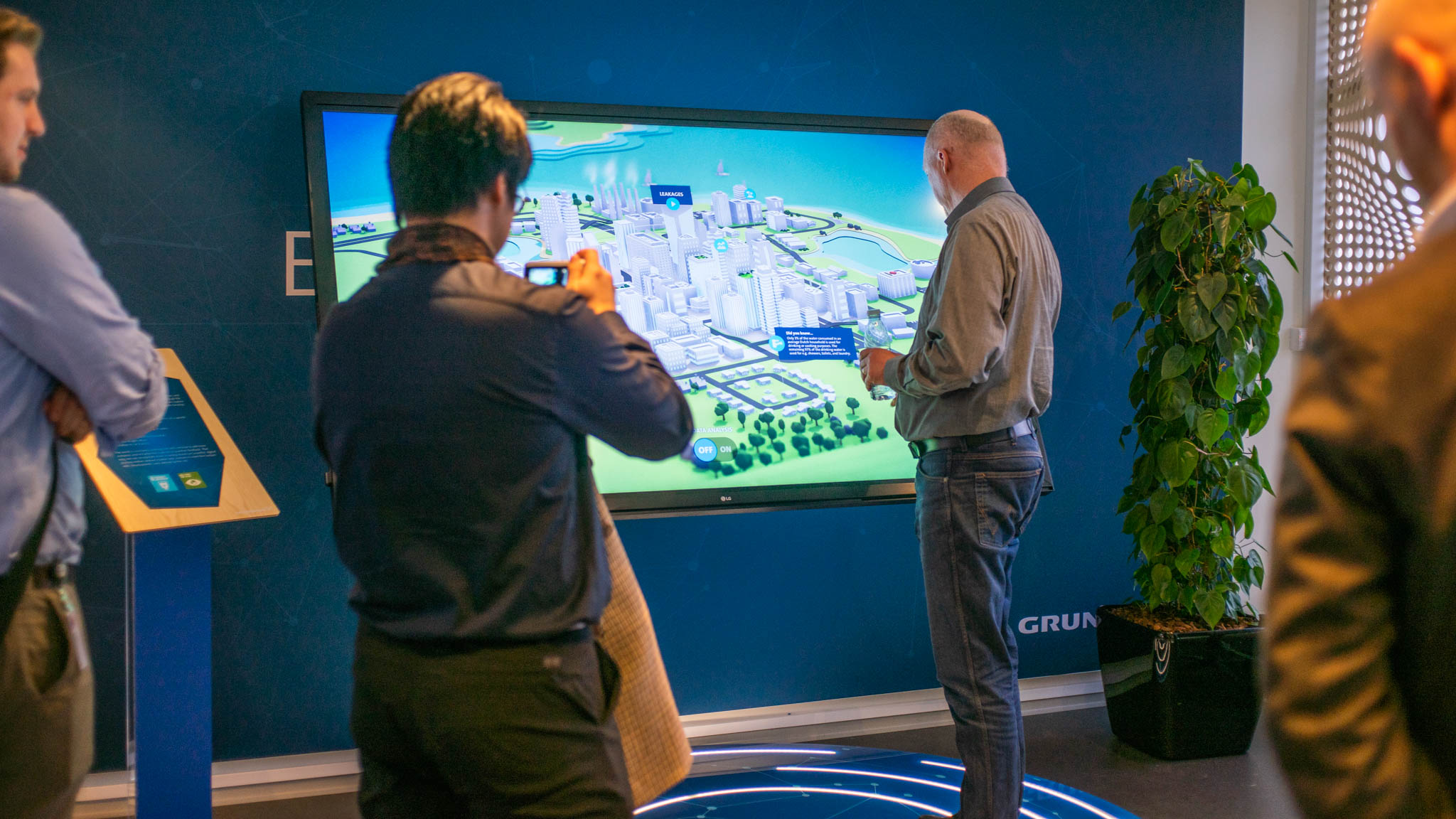 This interactive installation, built with a 65" touch screen, was designed and built by our designers and developers in Unity. Modelling buildings, streets, clouds, crafting compelling scenarios with multiple endings and everything that comes with launching this experience has been designed and developed in detail. This installation can be experienced at the Grundfos Centre in Mölndal, Sweden.