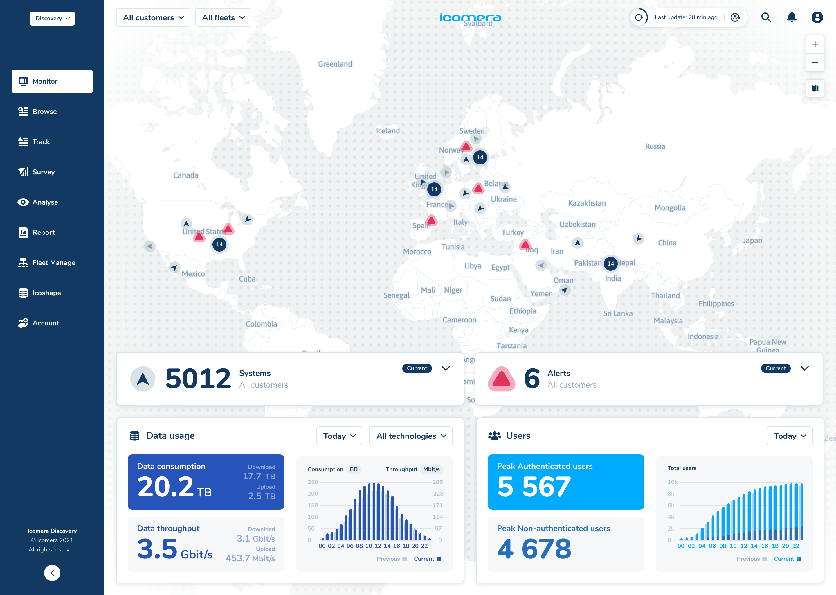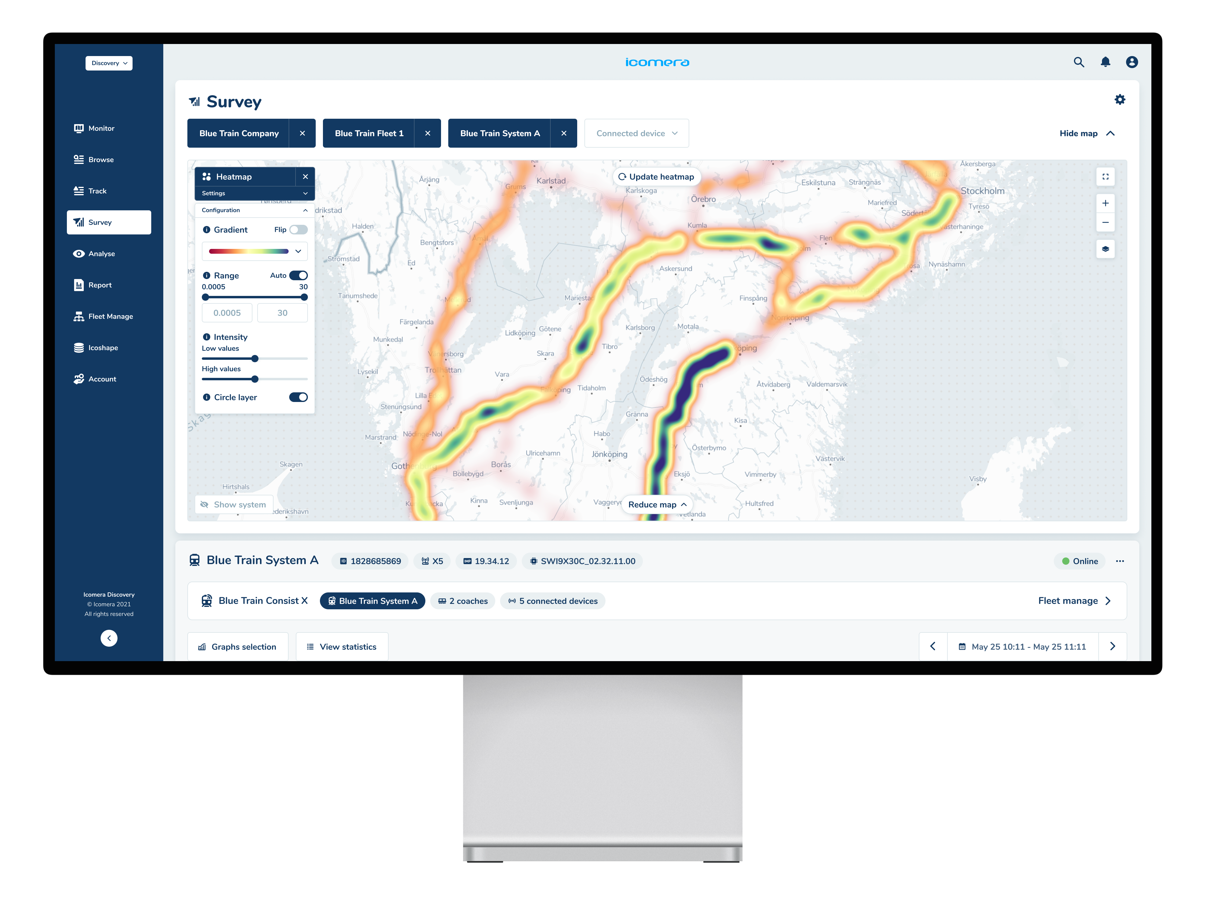 As the leading provider of mobile Internet connectivity solutions for public transport, Icomera serves millions of passengers daily. All this data needs to be handled efficiently to maintain a fast and reliable connection. That's where the Discovery tool comes into play. Developed from the ground up, Discovery is a powerful cloud-based platform and tool that provides enhanced monitoring of fleets and systems in real-time, enabling unrivaled analysis capacity for operators and a smoother wifi experience for passengers.