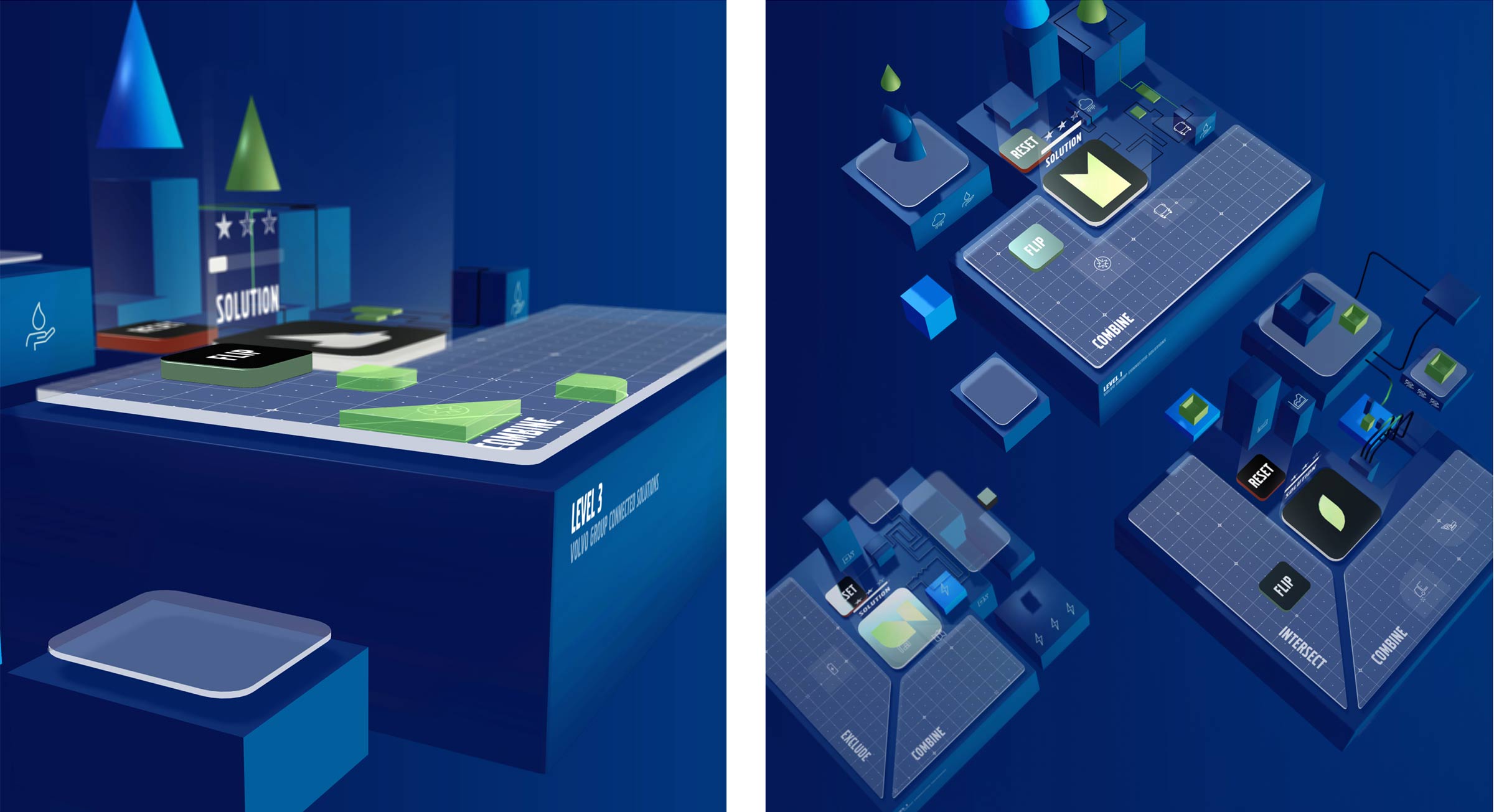 This puzzle game requires quick problem solving to clear all the levels. The goal with the puzzle is to build services by combining and subtracting data chunks - visualized with simple blocks, each with descriptions to get a peek into what data Volvo Group works with. There are three worlds with four levels, increasingly getting harder to solve. The faster the user solves a level, the more points they get that are added to their score.