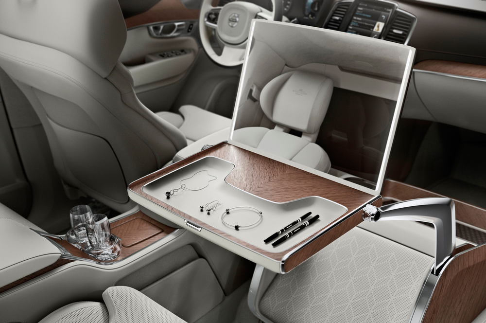 The Lounge Console incorporates features designed to enhance the in-car experience. Interaktionsbyrån have engineered a large work table which opens to reveal an illuminated vanity mirror, including a storage tray for jewelry and personal accessories or make-up. The table rotates 90 degrees and simultaneously powers forward to display a large 17” media screen for a full in-car theater experience. Below the cushioned leg rest is an additional area for shoes.